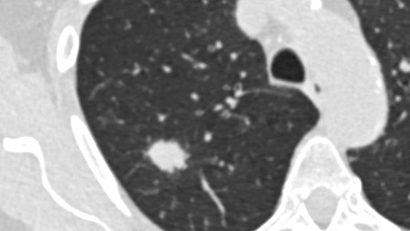 Niedrigdosis-CT-Aufnahme der Lunge einer 69-jährigen Raucherin. Die weiße rundliche Fläche im Lungengewebe deutet auf Lungenkrebs im Frühstadium hin. In diesem Stadium kann Lungenkrebs noch gut behandelt werden.