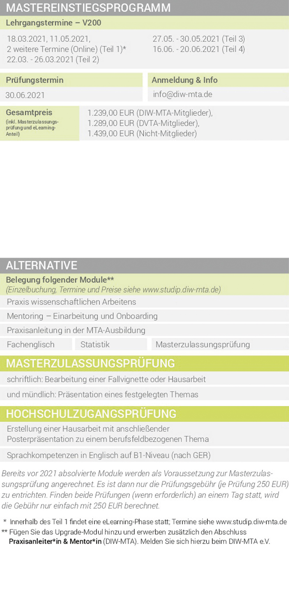 Für alle Interessierten, die noch nicht die genannten Zulassungsvoraussetzungen zum Masterlehrgang erfüllen, bietet das DIW-MTA in Berlin ein Mastereinstiegsprogramm an. Die entsprechenden Termine und inhaltlichen Anforderungen entnehmen Sie bitte der Tabelle. Bitte wenden Sie sich an das DIW-MTA, um sich für das V200 – Mastereinstiegsprogramm anzumelden.