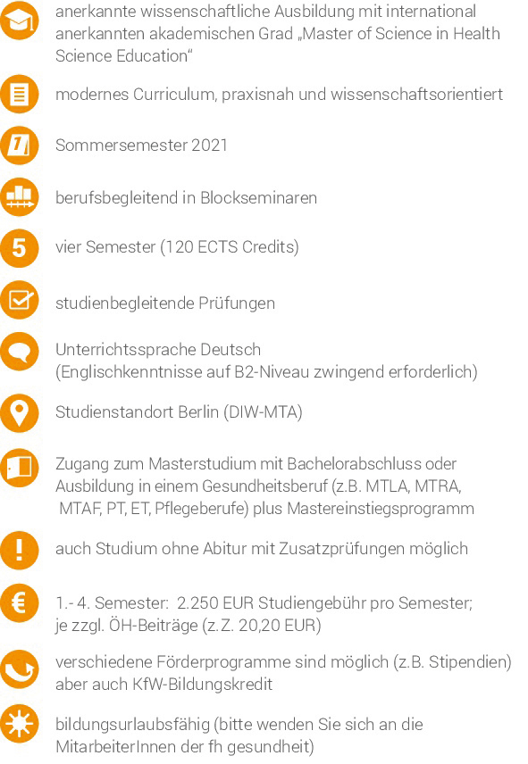 Die fh gesundheit in Innsbruck (Österreich) und das DIW-MTA in Berlin bieten in Kooperation ab März 2021 für Lehrende an Schulen des Gesundheitswesens (zum Beispiel MTA-Schulen, Pflegeschulen, PTA-Schulen) sowie für diejenigen, die es werden wollen, die Möglichkeit, berufsbegleitend einen viersemestrigen Masterlehrgang in „Pädagogik in Gesundheitsberufen“ mit einem international anerkannten Abschluss „Master of Science in Health Science Education (MSc)“ mit 120 ECTS-Credits zu absolvieren. Studienort ist Berlin.