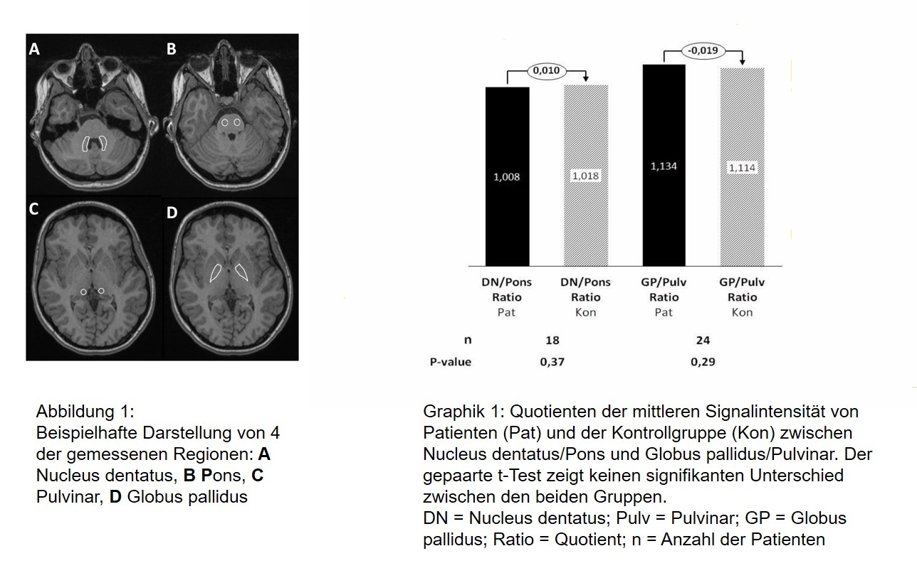 Um reifungsbedingte Veränderungen im Gehirn auszugleichen, wurde jedem Kind eine gleich alte Vergleichsperson mit unauffälligem Kopf-MRT ohne Kontrastmittelgabe zugeordnet. Dann wurden die Signalintensitäten verglichen. „Wir fanden in zwei für die Ablagerungen relevanten Regionen des Gehirns, dem Globus pallidus und dem Nucleus dentatus, keine höhere Signalintensität im Vergleich zur Kontrollgruppe. Und es gab auch keinen Zusammenhang zwischen der Zahl der MRT-Untersuchungen und der Signalintensität“, fasst Klee die Ergebnisse zusammen.