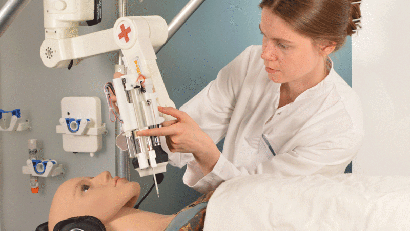 Mithilfe des neuen Mechanismus, den Müller zusammen mit Forschenden aus dem Lehrstuhl für Mikrotechnik und Medizingerätetechnik (MiMed) der TUM entwickelt hat und der nun erstmals auf der Automatica gezeigt wird, dringen die Nadel und der sie umgebende Katheter durch die Haut in den Brustkorb ein. Während die Nadel wieder herausgezogen wird, verbleibt der Katheter im Körper und die Luft kann entweichen. „So wird entscheidende Zeit gewonnen, um Betroffene eines Spannungspneumothorax etwa nach einer Brustkorbverletzung infolge eines Verkehrsunfalls oder einer Schussverletzung behandeln zu können“, erläutert Prof. Peter Biberthaler, Direktor der Klinik und Poliklinik für Unfallchirurgie des TUM Klinikums.