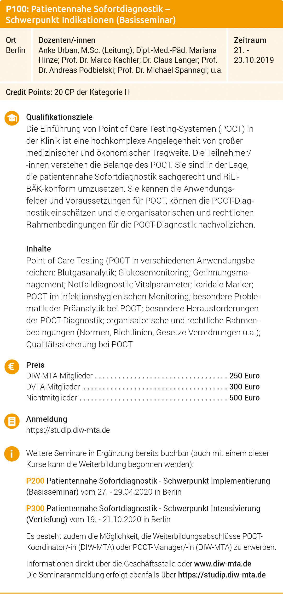 Neben der Belegung einzelner POCT-Seminare, ist die Weiterbildung zum/zur POCT-Koordinator/-in (DIW-MTA) möglich. In dieser Kompaktweiterbildung (160 h) erwerben die Teilnehmer/-innen die Grundlagen der Koordinierungsarbeit von POCT im Krankenhaus. Darüber hinaus wird auch eine zweijährige Weiterbildung zum/zur POCT-Manager/-in DIW-MTA (640 h) angeboten. Diese ist vom Landesamt für Gesundheit und Soziales (LAGeSo) des Landes Berlin staatlich anerkannt und erweitert das Wissen um weitergehende Managementkompetenzen. In dieser Weiterbildung liegt der Fokus auf Themenfeldern wie Ausschreibungen, Implementierung, Steuerung, Risiko-, Prozess- und Qualitätsmanagement sowie Finanzierung et cetera, Inhalten also, die über die reine Prozesskoordination hinausgehen und profunde Managementkompetenzen erfordern. In Häusern, in denen POCT gut organisiert ist, verlaufen die relevanten Prozesse gut und strukturiert. Sind Strukturen und Rollen im Prozessverlauf jedoch nicht geklärt oder nicht vorhanden, so sind Reibungsverluste „vorprogrammiert“. Vor allem, wenn es darum geht, den kontinuierlichen adäquaten Geräteeinsatz adäquat sicherzustellen. Dazu gehört auch, dass Geräte einwandfrei kalibriert und Messungen von geschultem Personal standardisiert durchgeführt werden.