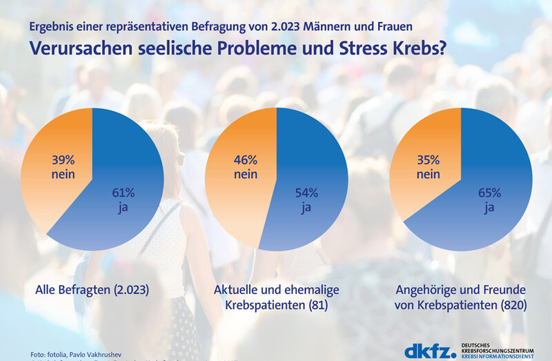 Auf der Suche nach Ursachen für Krebs wird immer wieder auf den vermeintlichen Zusammenhang mit psychischen Belastungen hingewiesen. Diese Vorstellung reicht zurück bis in die Antike: Schon Hippokrates vertrat die Anschauung, dass melancholische Menschen eher erkranken. Wie sehen das die Deutschen heute? Der Krebsinformationsdienst des Deutschen Krebsforschungszentrums legt aktuelle Daten aus einer repräsentativen Befragung von mehr als 2.000 Männern und Frauen vor. Das Ergebnis lässt aufhorchen: Eine große Mehrheit ist davon überzeugt, dass seelische Belastungen der Auslöser für eine Krebserkrankung sind – trotz mangelnder wissenschaftlicher Belege.