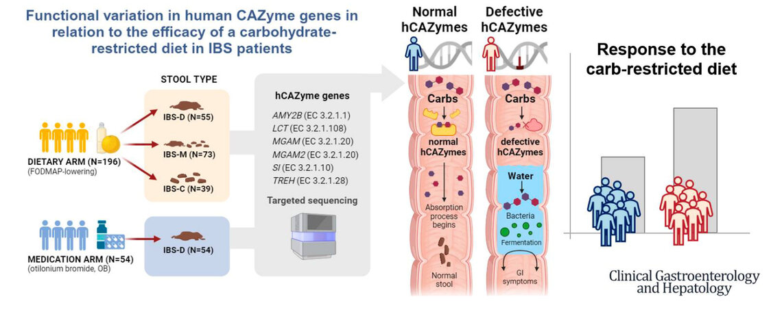Forschungsarbeiten mit Beteiligung des Instituts für Klinische Molekularbiologie (IKMB) der Christian-Albrechts-Universität zu Kiel (CAU) und des Universitätsklinikums Schleswig-Holstein (UKSH), Campus Kiel, haben die Rolle der hCAZymes in Bezug auf das Reizdarmsyndrom untersucht. In einem groß angelegten europäischen Forschungsverbund, dem GenMalCarb-Konsortium, konnte das Team nun zeigen, dass Personen mit defekten Varianten in hCAZyme-Genen eher von einer kohlenhydratreduzierten Ernährung profitieren. In der Studie, an der 250 Patientinnen und Patienten mit Reizdarmsyndrom teilnahmen, wurden zwei Behandlungen miteinander verglichen: eine Ernährung mit wenig fermentierbaren Kohlenhydraten (FODMAPs) und das krampflösende Medikament Otiloniumbromid. Von den 196 Betroffenen, die an der low-FODMAP-Ernährung teilnahmen, zeigten diejenigen, die Träger eines defekten hCAZyme-Gens waren, eine deutliche Verbesserung im Vergleich zu den Nicht-Trägern. Die Wirkung war besonders ausgeprägt bei Betroffenen mit überwiegend diarrhöischem Reizdarmsyndrom (IBS-D), sie sprachen sechsmal häufiger auf die Diät an. Im Gegensatz dazu wurde dieser Unterschied bei Patientinnen und Patienten, die Medikamente erhielten, nicht beobachtet.