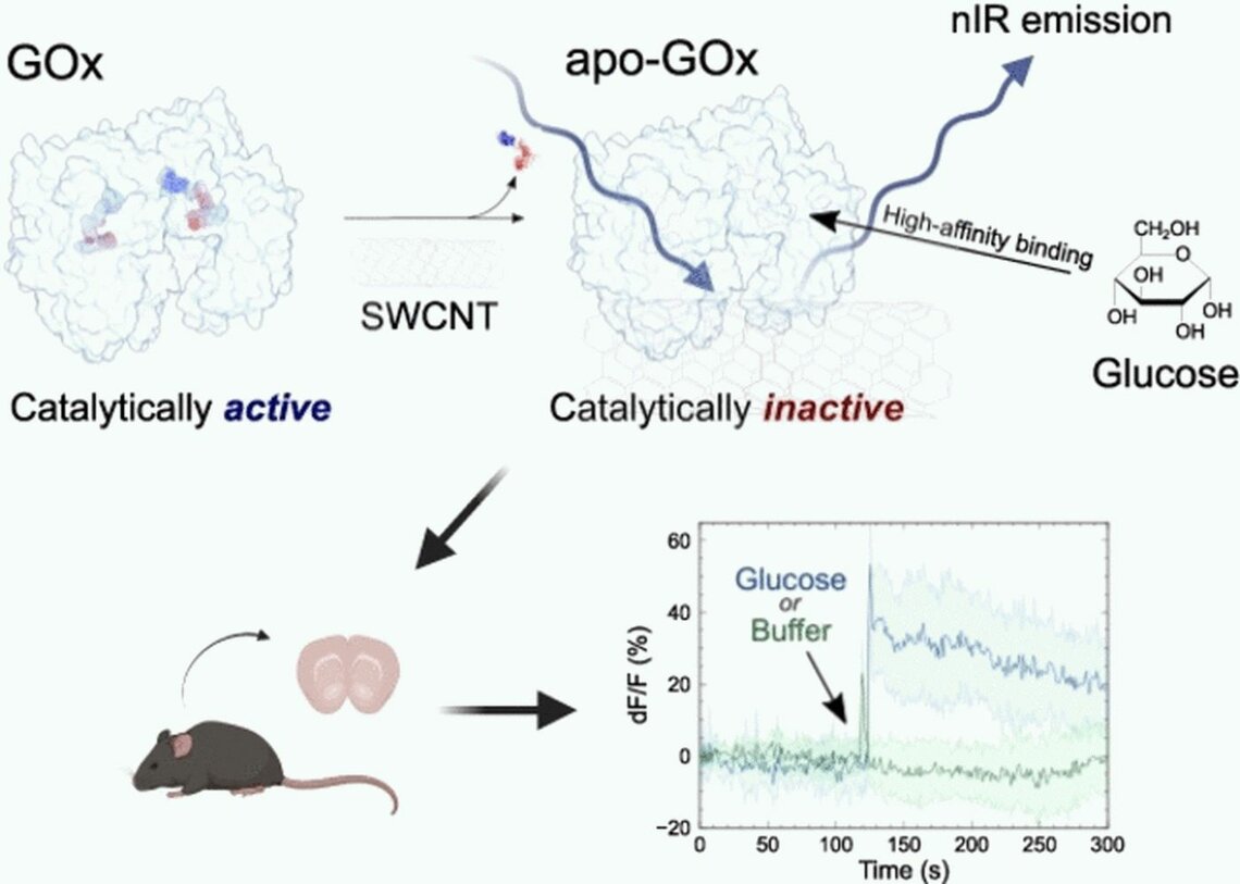 Diesen überraschenden Befund erklären die Forschenden mit Eigenschaft des GOx-Enzyms, durch die Ultraschallbehandlung zwar nicht mehr aktiv Glukose umzusetzen, das Substrat aber trotzdem zu binden. Mit dieser Bindung allein wurde das Fluoreszenzsignal empfindlich moduliert. Um vollständig unabhängig von der GOx-Aktivität zu sein, konstruierten die Forschenden sogar ein GOx-Enzym ganz ohne reaktive Gruppe für die Glukoseumsetzung. Der daraus hergestellte sogenannte Apo-GOx-SWCNT-Sensor wies Glucose in Körperseren und Gehirnschnitten von Mäusen genauso zuverlässig nach wie das zuvor verwendete Konjugat aus SWCNTs und natürlicher GOx.