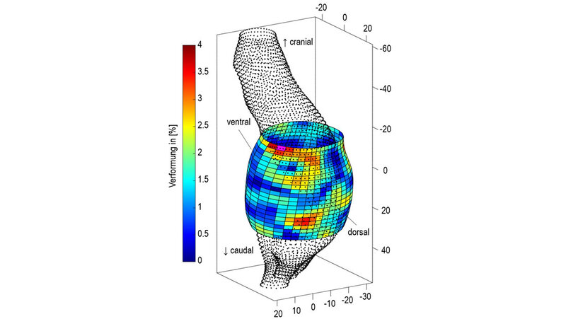 „Bauchaortenaneurysmen beginnen mit einer degenerativen Veränderung der Materialeigenschaften der Aortenwand. Im weiteren Verlauf kann sich die Wand wieder stabilisieren – oder bis zur Ruptur weiter schwächen, der Unterschied beider Krankheitsverläufe besteht in den Materialeigenschaften der Wand, die im Gegensatz zu technischen Materialien nicht ein für alle Mal feststehen, sondern vom Körper beständig remodelliert werden. Dennoch sind die klinisch etablierten Kriterien für eine chirurgische Behandlung oder weitere Beobachtung eines Bauchaortenaneurysmas der maximale Durchmesser und seine Wachstumsrate, nicht die individuellen Materialeigenschaften, weil es bislang nicht möglich war, diese Patientinnen/Patienten individuell zu bestimmen“, erläutert Dr. Christopher Blase vom Labor für Biomechanik. „Gemeinsam mit unseren klinischen Partnern hat unsere Forschungsgruppe die zeitaufgelöste dreidimensionale Verformungsmessung der Aneurysmenwandbewegung am lebenden Menschen mit Ultraschall weltweit erstmals etabliert.“ „Basierend auf diesen neuartigen Daten haben wir Methoden entwickelt, die die Bestimmung der individuellen Materialeigenschaften der Wand erlauben“, ergänzt Dr. Andreas Wittek, „damit stehen zusätzliche Informationen zur Beobachtung und Einschätzung des Krankheitsverlaufs und möglicherweise zur präziseren Einschätzung des Rupturrisikos zur Verfügung.“