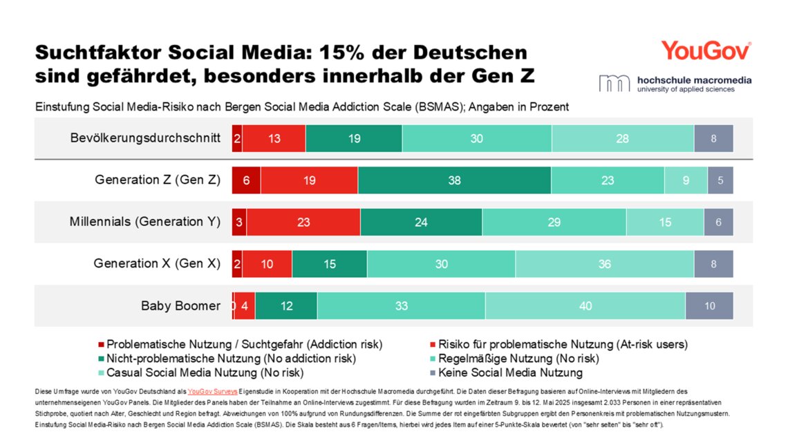 Die aktuelle Befragung legt offen, dass etwa 15 Prozent typische Anzeichen eine Social Media-Sucht aufweisen. Dabei liegt der Anteil in der Generation Z sogar bei 25 Prozent, bei den Millennials bei 26 Prozent, wohingegen die Generation X ein Suchtpotenzial von 12 Prozent zeigt und die Babyboomer liegen bei nur 5 Prozent. 85 Prozent der Befragten gaben ein, mindestens eine Social Media-Plattform täglich zu besuchen, bei 60 Prozent hat das laut eigener Angaben keine negativen Auswirkungen auf den Job.