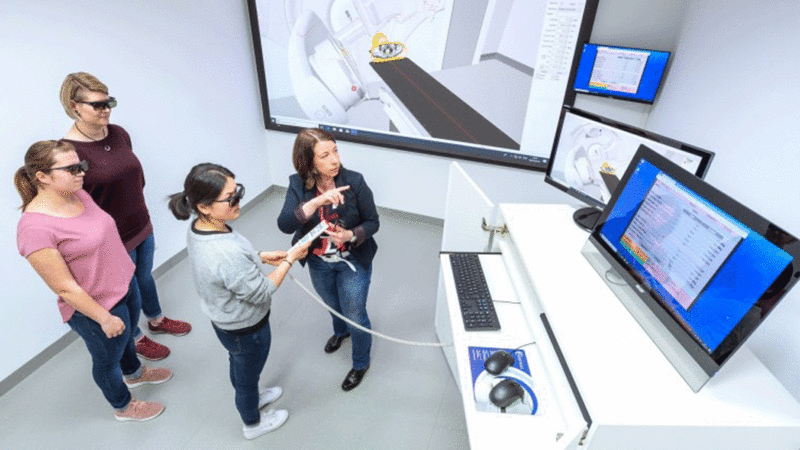Die Auszubildenden, die während des Trainings 3-D-Brillen tragen, können sämtliche Berechnungen und Einstellungen vornehmen, die auch beim echten Gerät nötig und möglich sind, die virtuelle Bestrahlungseinheit auf der Leinwand reagiert entsprechend. So können beispielsweise die Drehung des Tisches, Position und Bewegung der Gantry mit Beschleunigerkopf, der Abstand des Fokus zur Haut sowie der Winkel des Therapiestrahls jeweils passend eingestellt werden.