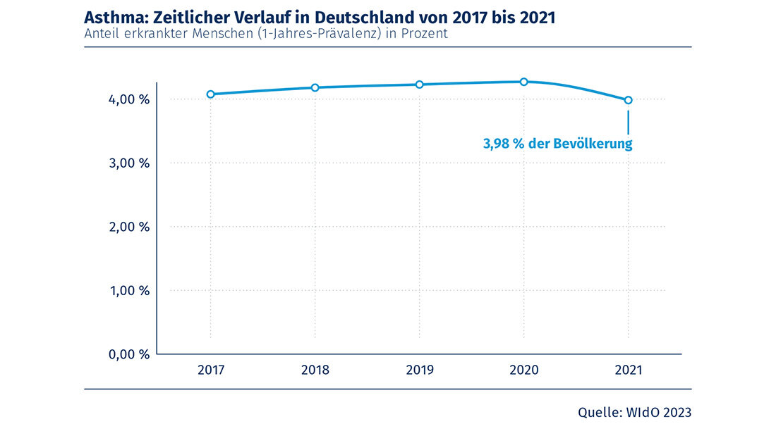 Beim medikamentös behandelten Asthma ist seit 2017 ein Anstieg bis zu einem Höchstwert von 4,27 Prozent im Jahr 2020 zu erkennen, gefolgt von einer Trendumkehr im Jahr 2021 (siehe Abb. unten). 2021 lag der Anteil in der Bevölkerung bei 3,98 Prozent; dies entspricht 3,3 Millionen Menschen in Deutschland, die wegen Asthma medikamentös behandelt wurden. Im Jahr 2020 waren noch 3,6 Millionen Menschen betroffen, 237.000 Patientinnen und Patienten mehr als im Jahr 2021.