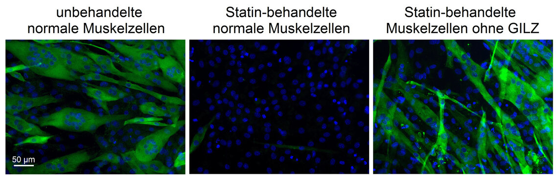 Auf diesen Anfangsverdacht hin analysierten die Pharmazeutinnen für ihre Studie zunächst zahlreiche Datensätze aus weltweit verfügbaren Forschungsdatenbanken: Sie werteten diese daraufhin aus, ob Statine Gilz beeinflussen. Nachdem ihr Verdacht sich erhärtet hatte, konnten die Forscherinnen ihre Vermutung in Versuchsreihen an lebenden Zellen bestätigen. „Statine bewirken, dass das Protein Gilz in den Zellen vermehrt gebildet wird. Dadurch beeinträchtigen sie die Muskelzellen. Denn die vermehrte Gilz-Produktion führt dazu, dass die Muskelzellen eher absterben. Zusätzlich wird die Bildung neuer Muskelfasern gehemmt“, erklärt Kiemer. Die Forscherinnen schalteten daher Gilz in lebenden Zellen aus und beobachteten dann die Wirkung der Statine. „Wenn wir die Behandlung mit Statinen an Muskelzellen oder ganzen Muskelfasern durchführen, bei denen Gilz genetisch ausgeschaltet wurde, bleibt die eben beschriebene Schädigung praktisch komplett aus“, stellt die Wissenschaftlerin fest.