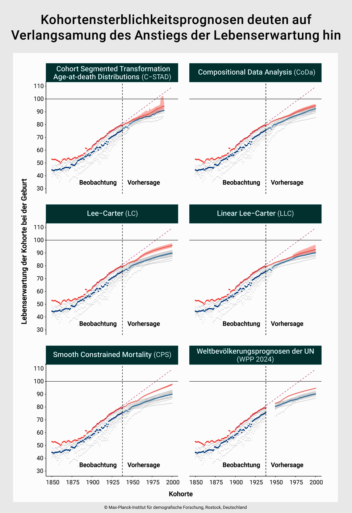 „Wenn die heutigen Generationen dem gleichen Trend folgen würden wie in der ersten Hälfte des 20. Jahrhunderts, könnte beispielsweise jemand, der 1980 geboren wurde, mit einer Lebenserwartung von 100 Jahren rechnen”, erklärt José Andrade, Erstautor der Studie und Forscher am Max-Planck-Institut für demografische Forschung (MPIDR). „Wir haben untersucht, ob sich das Anstiegstempo der Lebenserwartung für die derzeit lebenden Kohorten verlangsamt.“ Zu diesem Zweck haben der Wissenschaftler und seine Kollegen die Lebenserwartung dieser Generationen prognostiziert. Ihre Berechnungen basieren auf Daten aus der Human Mortality Database (HMD). Mit Hilfe von sechs verschiedenen Methoden zur Sterblichkeitsprognose – statistische Verfahren, die auf der Grundlage vergangener und aktueller Sterblichkeitsdaten fundierte Vorhersagen über die zukünftige Lebenserwartung treffen – schätzte das Forschungsteam die zukünftige Entwicklung der Lebenserwartung.