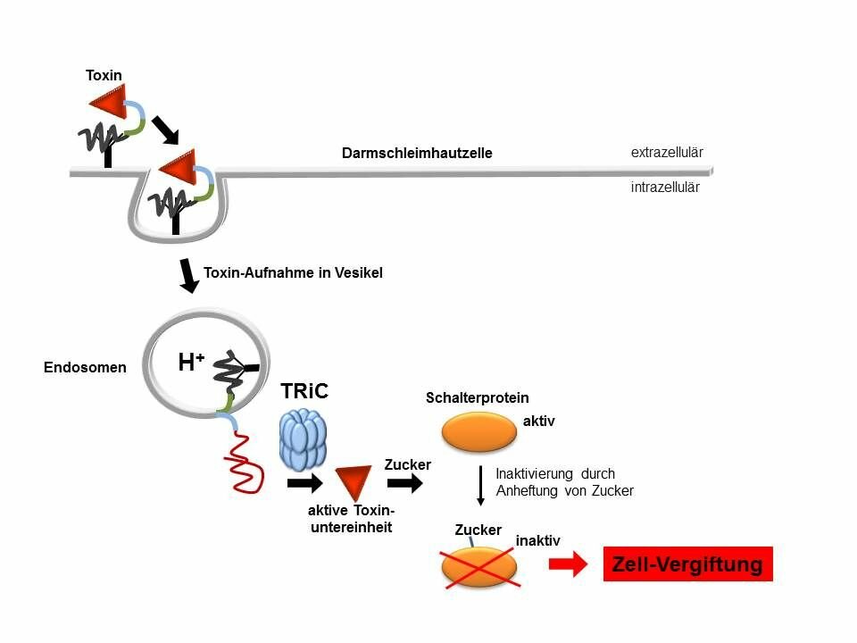 Das Bakterium Clostridium difficile produziert im Darm Giftstoffe, die in die Zellen der Schleimhaut eindringen und deren Schrankenfunktion stören. Wie diese Toxine in den Zellen wirken, ist seit Langem bekannt: Sie übertragen Zucker auf Schalterproteine, die dadurch inaktiv werden. In der Folge wird der Zusammenhang von Darmzellen gestört und es kommt zum Zelltod. Wie die vergleichsweise großen Proteine dieser Toxine in die Wirtszellen eindringen, war bisher nicht geklärt. Bekannt war lediglich, dass die bakteriellen Giftstoffe an Rezeptoren auf der Oberfläche von Darmzellen binden und aus Bläschen im Zytoplasma, den so genannten Vesikeln, durch kleine Poren ins Zellinnere gelangen.