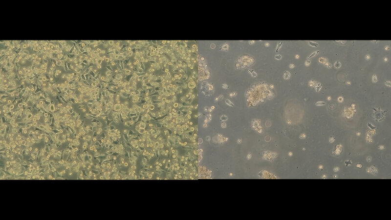 Einige Prüflaboratorien führen antivirale Tests mit sogenannten Phagen durch, weil diese einfacher durchzuführen sind. Diese Viren nutzen Bakterien als Wirtszellen, um sich zu vermehren. An den DITF habe man im Rahmen eines Forschungsprojektes einen anderen, realitätsnäheren Ansatz, verfolgt. Hier sei die antivirale Aktivität mit Coronaviren bestimmt worden. Mit dem MHV-Virus sei ein Coronavirus ausgewählt worden, welches sehr eng mit dem SARS-CoV-2-Virus verwandt ist und eukaryontische Zellen als Wirt benutzt. Das Prüfverfahren zur Bestimmung der Effektivität gegenüber Coronaviren sei dabei sowohl an die Viren als auch an die Wirtszellen angepasst worden. Dringen die Viren in die Wirtszellen ein und nutzen diese als „Vermehrungsmaschine“, zeigen diese Zellen Schädigungen, sogenannte zytopathische Effekte, welche im Lichtmikroskop deutlich sichtbar sind. Die sichtbare Schädigung der Wirtszellen macht man sich zunutze, um die Anzahl der Viren zu bestimmen, die aufgrund ihrer sehr geringen Größe im Lichtmikroskop nicht sichtbar sind.