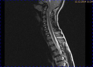 Abb. 3.1 T2 TSE sagittal: progrediente intraspinale Tonsillendislokation mit nachweisbarem Ödem des Zervikalmarks in Höhe von HWK 2
