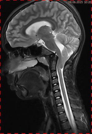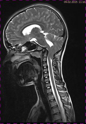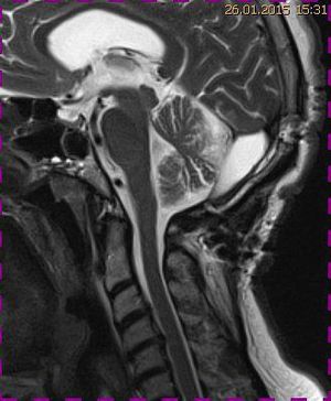 Abb. 4.2 MRT (T2 TSE, 1,5 T) sagittal: Kontrolle nach 1 Jahr, Ausschluss Tumorrezidiv, normale Position der Kleinhirntonsillen