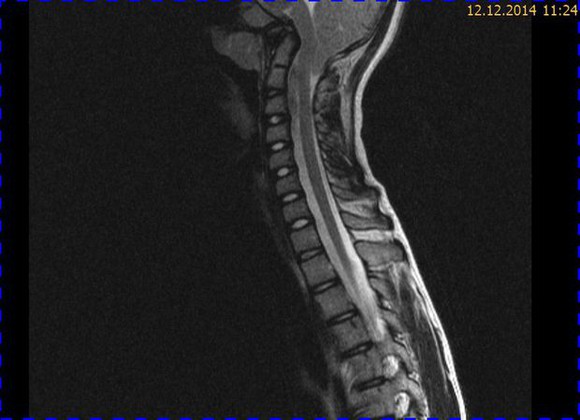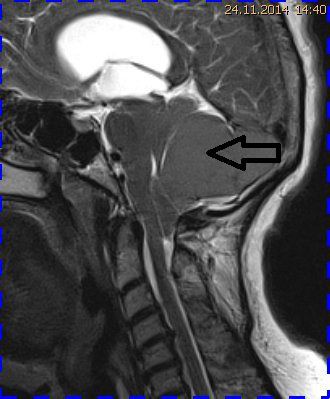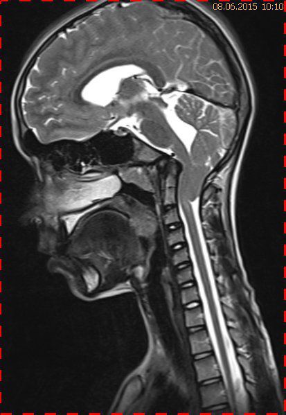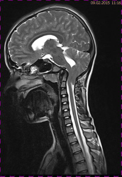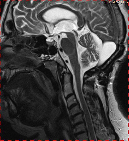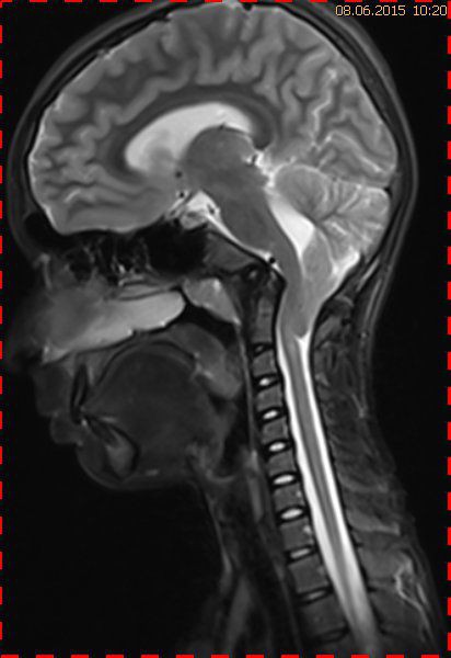 Bei dieser Untersuchung wurde übersehen, dass die Kleinhirntonsillen in das Foramen magnum disloziert waren und eine Arnold-Chiari-Malformation mit Erweiterung des 4. Ventrikels und des Aquäduktes inklusive Kleinhirntonsillentiefstand vorlag. Bei zwischenzeitlich auswärtig erfolgtem CT der HWS wurde eine Anlagestörung im kraniozervikalen Übergang beschrieben. Eine Kontrolluntersuchung des Kopfes weitere 4 Monate später dokumentierte neben einem medullären Ödem einen progredienten Tonsillentiefstand, der zur neurochirurgischen Behandlung mit operativer Erweiterung des Foramen magnum führte.