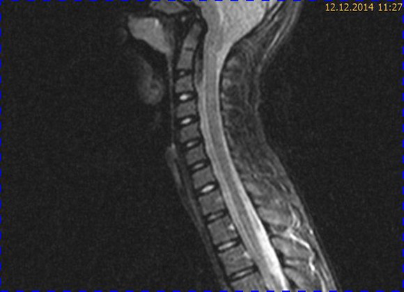 Abb. 3.2 T2 TIRM: das intramedulläre Ödem wird durch die Tonsillenkompression reproduzierbar dargestellt, betonter Zentralkanal des Halsmarks