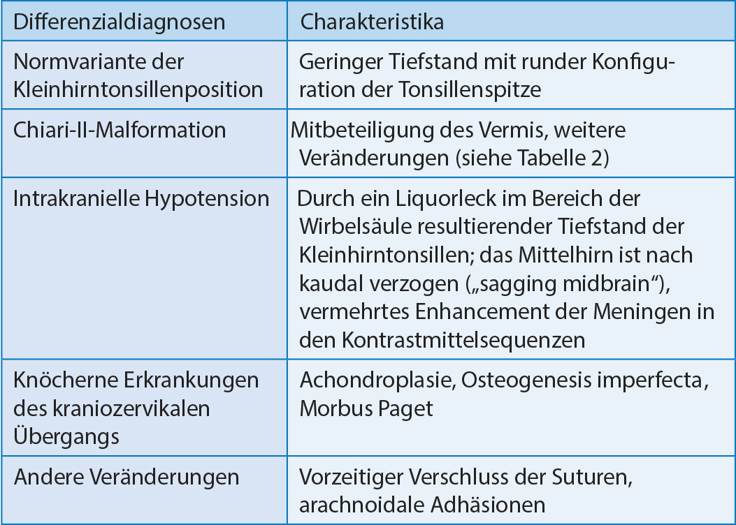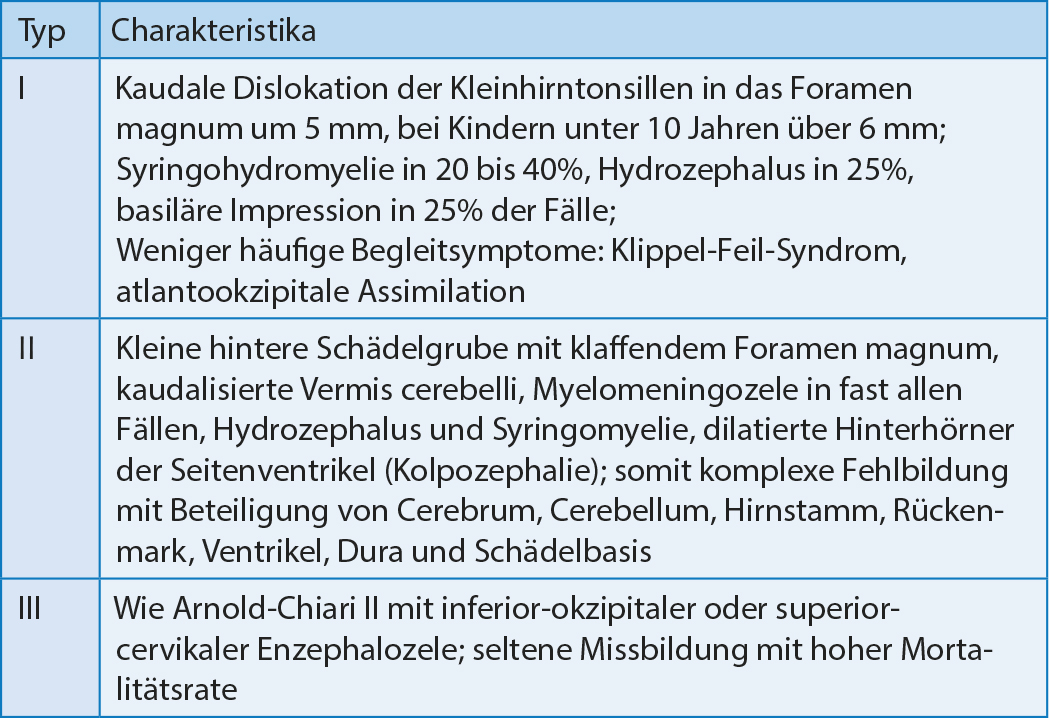 Im vorgestellten Fall war im Verlauf eine Komplikation mit progedienter Dislokation der Kleinhirntonsillen nach Schädelkontusion mit Stauchung der Halswirbelsäule aufgetreten bei einer bislang nicht bekannten Arnold-Chiari-Malformation Typ I. Diese Fehlbildung kann zu unterschiedlichen zerebralen und spinalen Veränderungen führen, je nach Typ mit unterschiedlicher Schwere der anatomischen Veränderungen und resultierenden neurologischen Symptome. In Tabelle 2 sind die unterschiedlichen Typen des Arnold-Chiari differenziert (1).