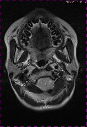 Abb. 2.2 MRT (T2 TSE transversal): obliteriertes Foramen magnum